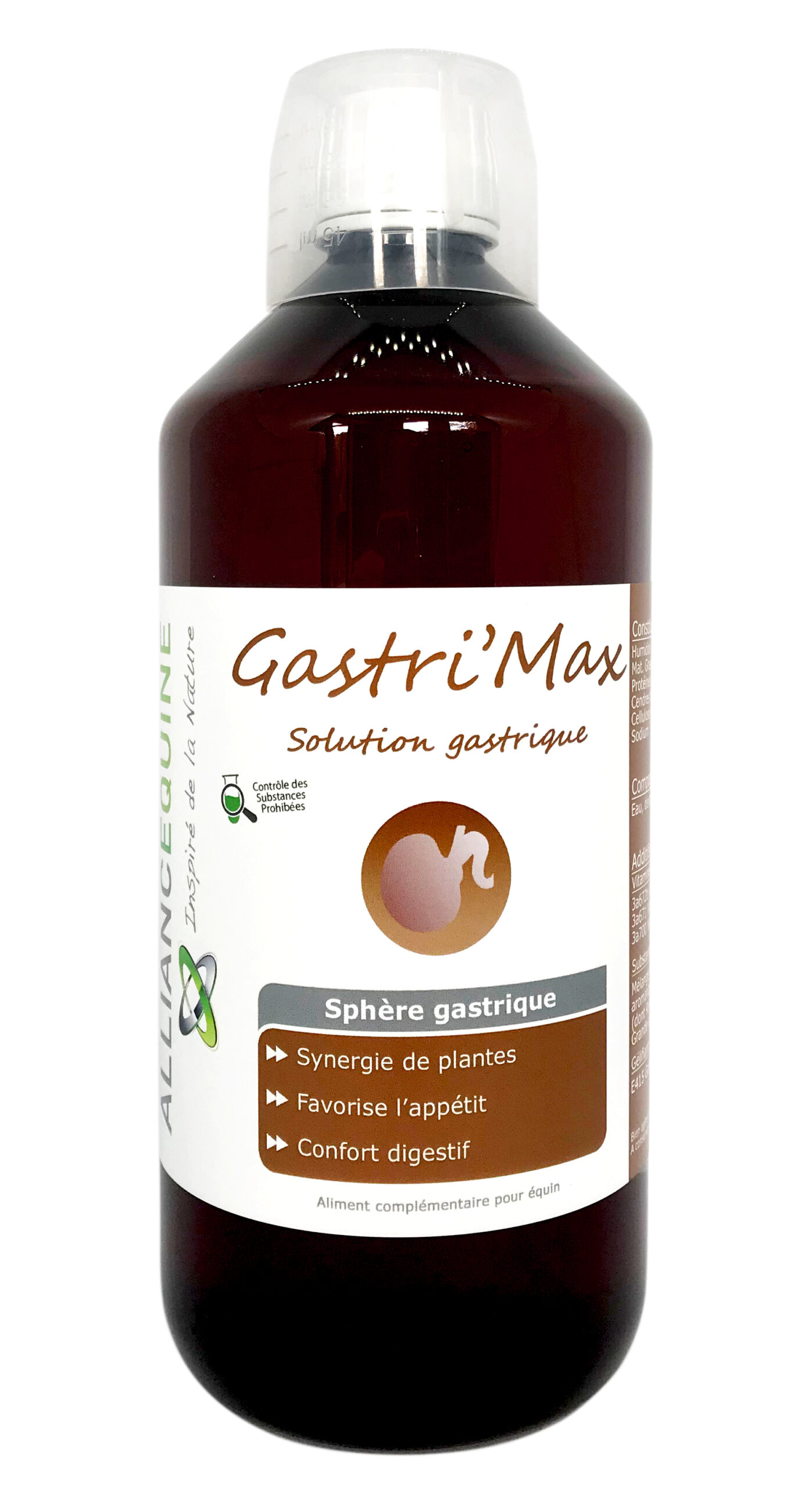les ulcères gastriques représentent la principale cause de contre-performance d’origine digestive. Gestri’Max est recommandé en cas de baisse d’appétit, baisse de performance, mauvais état général ou perte d’état, signes d’inconfort au toucher (sangle par exemple) pour soulager et diminuer l’inflammation des muqueuses. Gastri’Max est aloboré à partir de plantes: Filipendula ulmaria/ Reine des Prés (Principe actif : Acide Salycilique): Antibactérien, Antiseptique et Réduit l’ulcération; Thymus vulgaris / Thym (Principe actif : Thymol): Stimule le système digestif, Action antispasmodique; Inula Helenium /grande Aunée (Principe actif : Inuline): Inula Helenium /grande Aunée (Principe actif : Inuline) Gastri’Max se donne directement dans la bouche à raison de 50 mL/jour, pendant minimum 20 jours. Entre les repas.